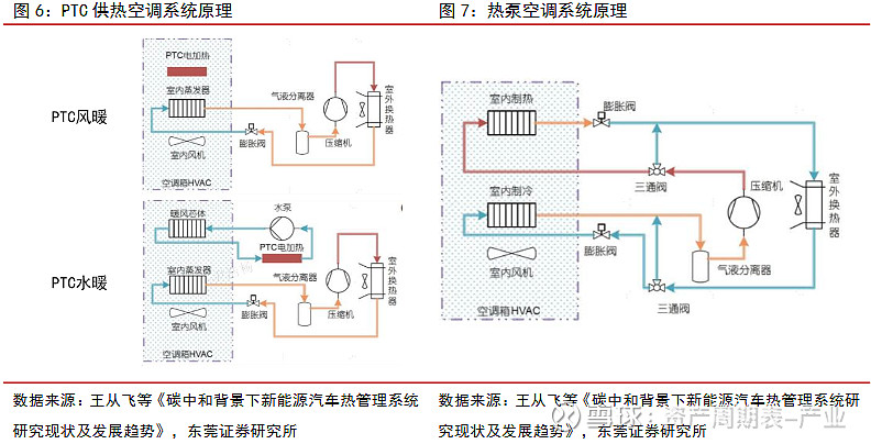采用PTC加热方案的新能源车热管理系统单车价值量为6000元(PTC制热的空调系统3000元),采用热泵加热方案的新能源车热管理系统单车价值量更高,为7000元以上(热泵制热的空调系统4000元)。