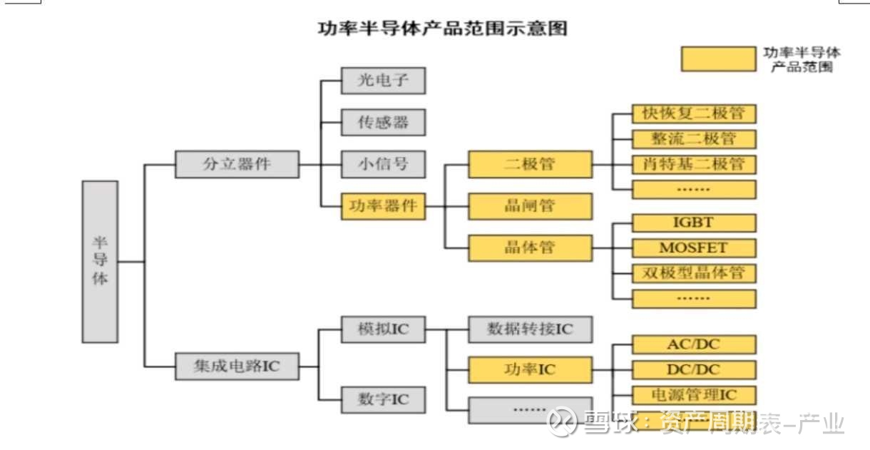 功率半导体整体是一个非常大的类别,可以分为集成电路和分立器件两类,在集成电路里属于模拟芯片(主要是电源管理芯片),而在分立器件下有你说的这几种。