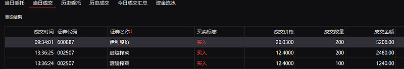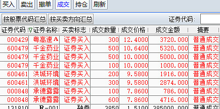 粤高速12.40买300对应12.78卖200,净买100均价11.64元,对应12.35卖500中100股;洪城环境9.58买对应9.98卖;平安银行10.44买对应11卖;千金药业下跌中10.64买、10元买对应11.11卖、10.52卖;伊利股份26.03买对应26.84卖出,此外,个别账户下跌加仓有新华文轩13.04买、13.14买、13.21买,补足第一批买入仓位。