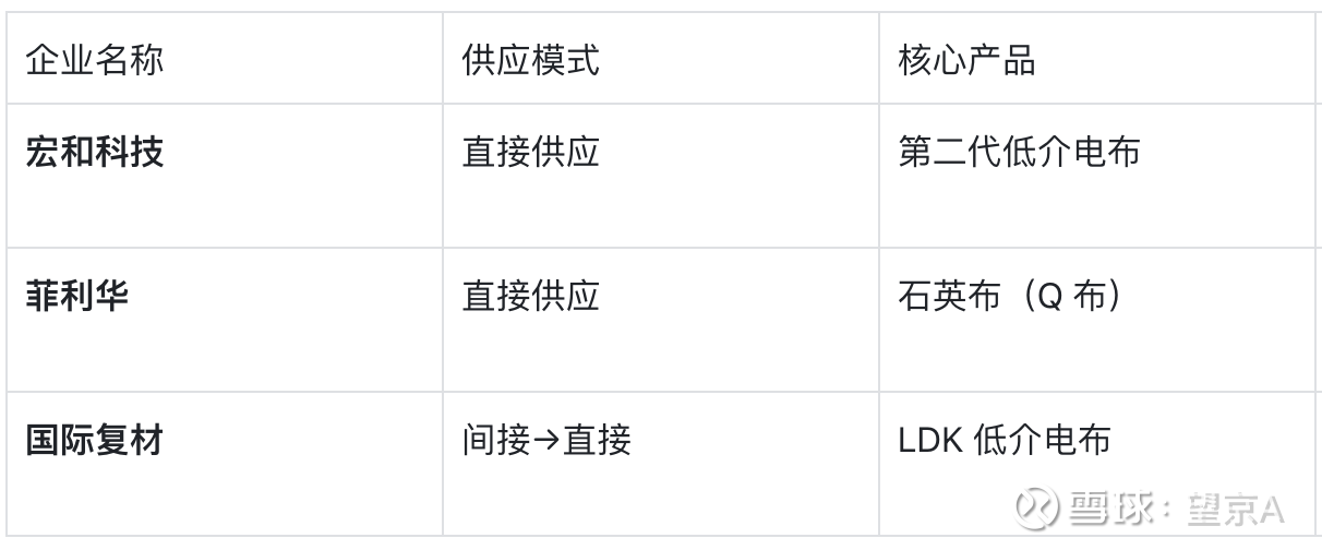 能被英伟达直接认证并供货的电子布企业,必须突破极致性能门槛,目前 A 股仅有宏和科技与菲利华两家实现,分别对应芯片封装与 PCB 基板的 “刚需场景”。