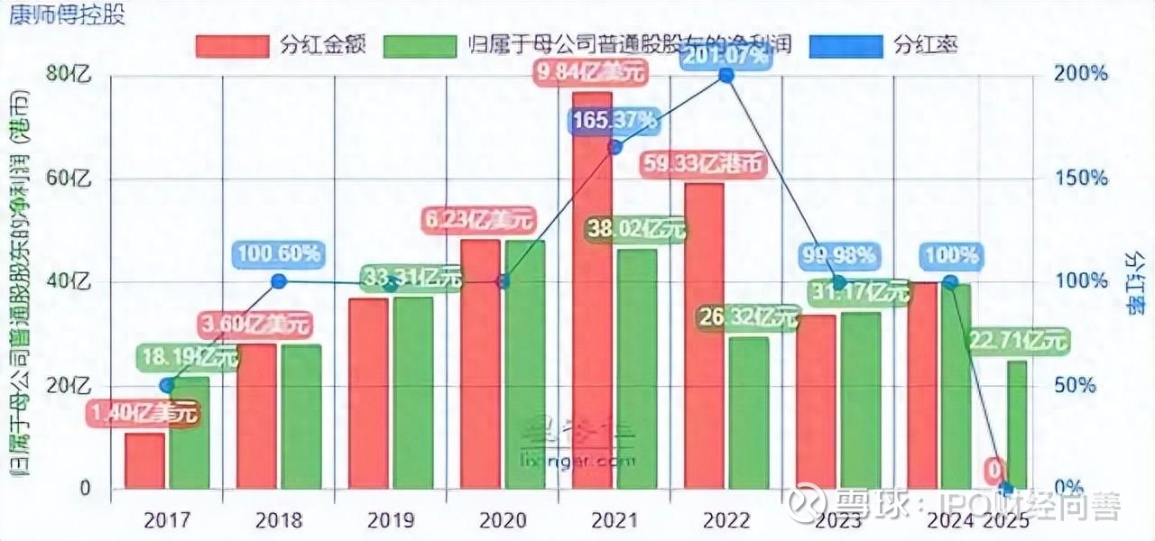 根据理杏仁统计数据显示,康师傅自2018年起,在长达七年的时间里,几乎每年都是百分百的分红率,甚至个别年份出现过200%的分红率。