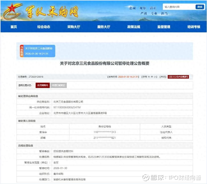 根据军队采购网报道,三元股份因在军队采购投标中提供虚假材料,被全军暂停物资工程服务采购资格,法定代表人袁宗浩与授权代表邱骞也被一并追责,并受到了处罚。