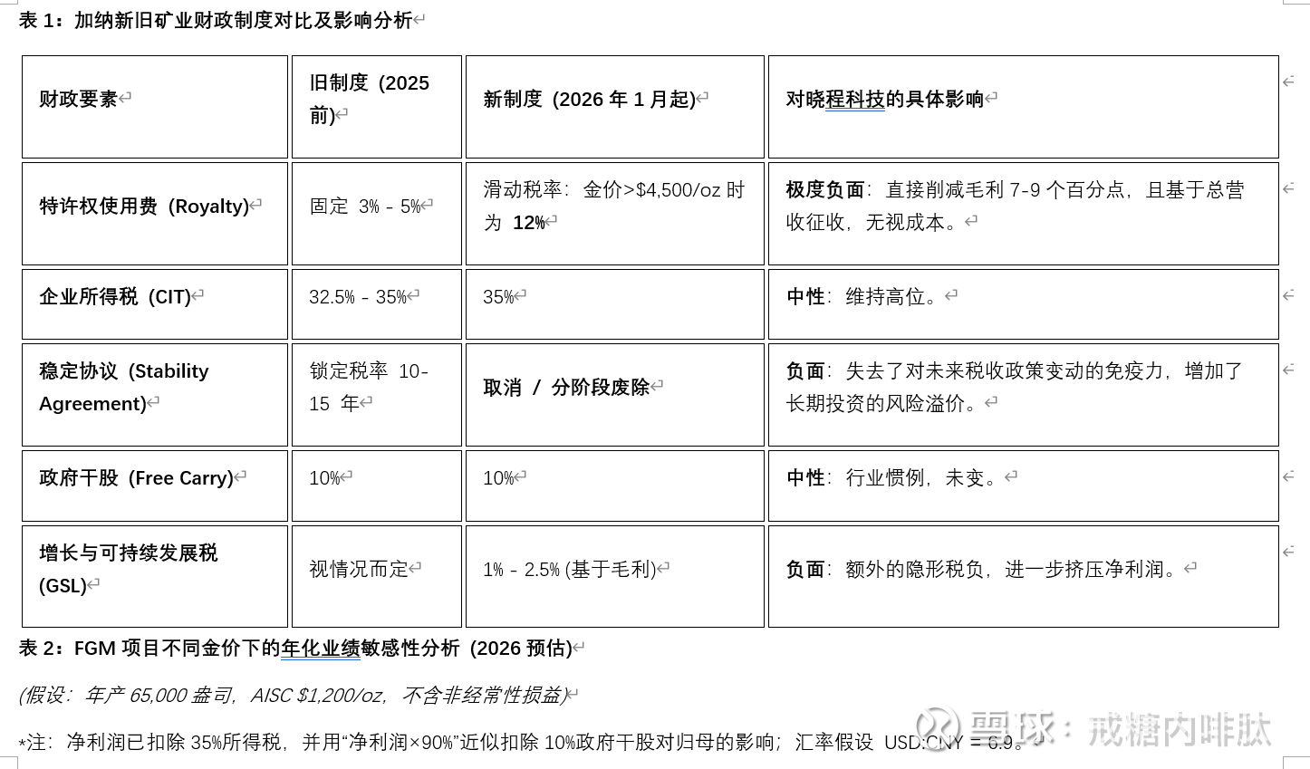 1.2.1 稳定协议的废除 2026年1月,加纳政府宣布了一项震惊行业的改革措施:逐步取消给予大型跨国矿企的长期投资稳定协议(Stability Agreements)。这些协议过去通常锁定10至15年的税收和特许权使用费率,是吸引外资的核心条款。新蒙特(Newmont)、安格鲁阿散蒂(AngloGold Ashanti)等巨头均受到波及 。虽然晓程科技作为中型矿企可能并未持有最高级别的国家级稳定协议,但这一政策信号表明,整个行业的税收环境正在从“通过优惠吸引投资”转向“存量资产的价值攫取”。