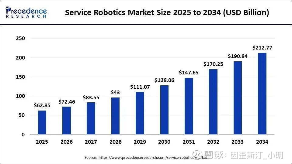 第三方机构数据预测显示,2024年全球服务机器人市场规模为545亿美元,预计2025年将达到629亿美元,至2034年或可达到2128亿美元,复合年均增长率15%。市场规模宏大、增速可观、场景丰富,包括餐饮、酒店、展厅、展馆、超市、工厂、医疗、养老等。