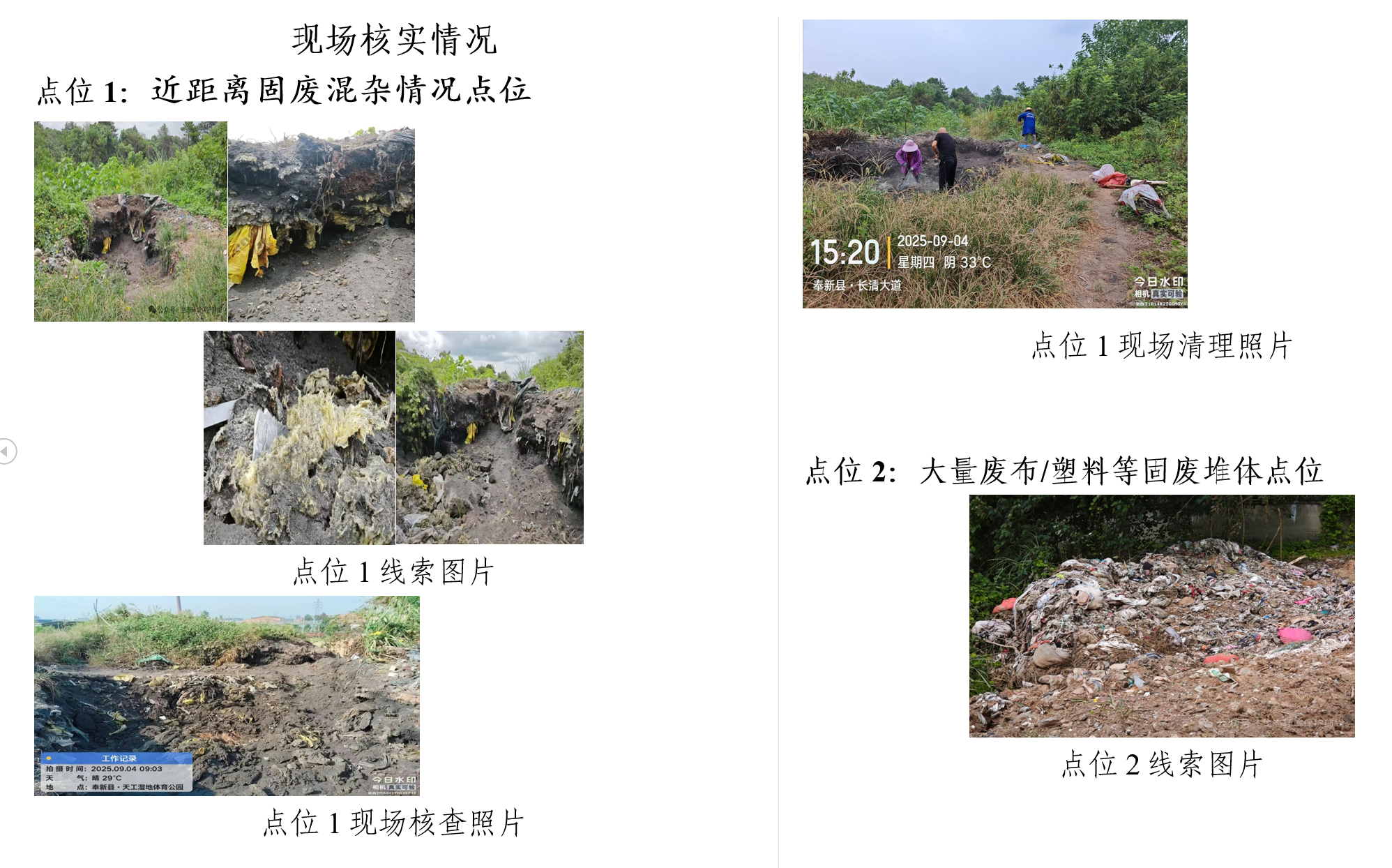 1.反映情况:线索反映该点位为存在明显堆体,有部分以土层覆盖或掩埋处理痕迹,但边缘可见大量杂物及固废残留。部分堆体表面虽有泥土覆盖,但内部有纺织物、塑料袋等混杂物裸露,疑似为生活垃圾/工业固废掺混倾倒后覆土掩盖。