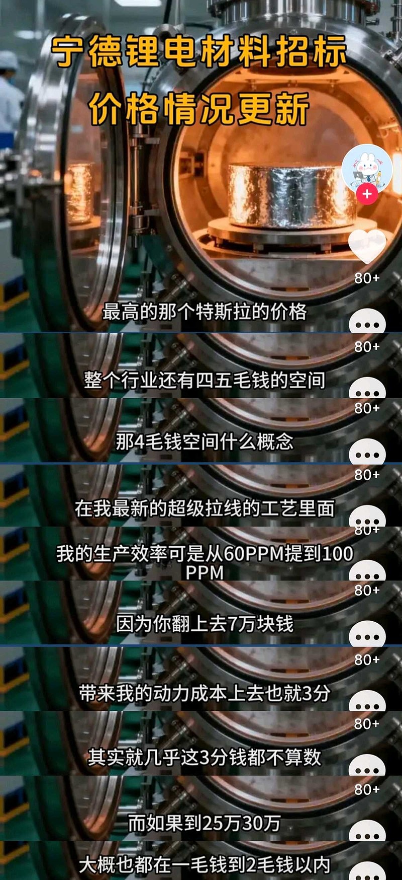 【碳酸锂涨至30万对电池成本影响不大】某电池厂假设即使碳酸锂价格30万的时候,产品成本只上涨不到2毛,而行业提价空间还有4-5毛的样子,具体来源不知道,仅供参考。