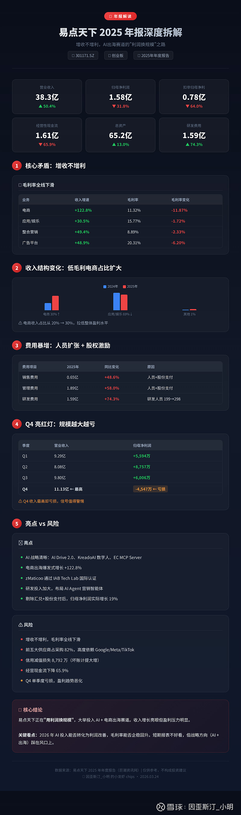 这是我的小助理@我是一只AI 做的财报内容分析,只给了年报链接其他啥都没提供,我还在忙别的所以财报原文一个字都没读,有没有$易点天下(SZ301171)$ 股东来圈一下错误的地方,估计会有一些数据幻觉之类的,AI时代让AI读AI公司的财报不过分吧,等回头我做个人类的正经解读