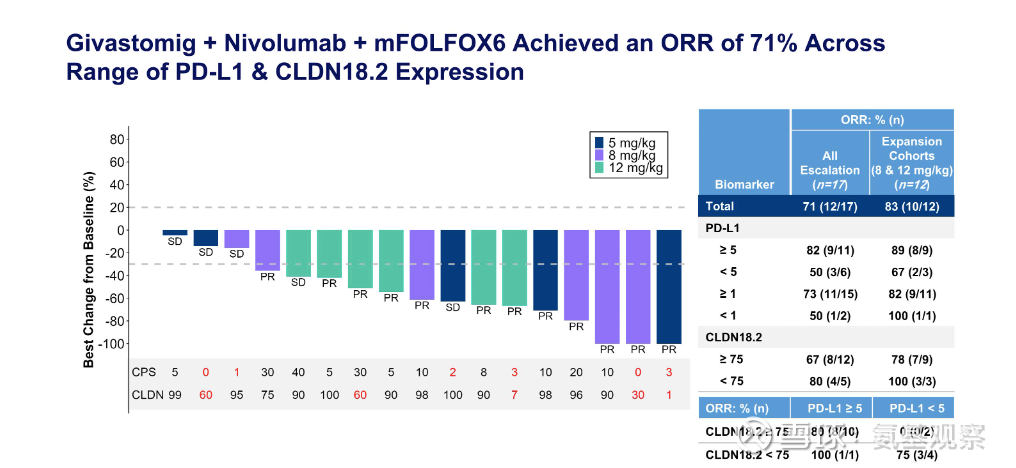 第一,效果显著,超越现有疗法潜力。在8mg/kg与12mg/kg剂量组,ORR高达83%。而目前在该领域,O药三联疗法的ORR在47%左右,CLDN18.2单抗Z药联合化疗更是只有40%左右。