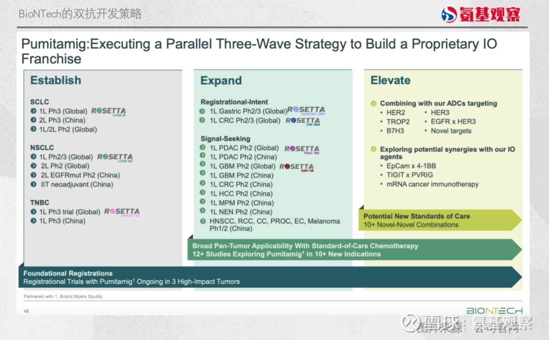 在最新的投资者会议上,BioNTech重申了“Establish、Expand、Elevate”三步走策略,并详细列出了临床试验列表。