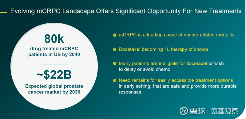 市场对此有较高期待。转移性去势抵抗性前列腺癌mCRPC 患者基数大且持续增长,现有化疗标准存在可及性与耐受性缺口,2030 年全球市场将达220亿美元。