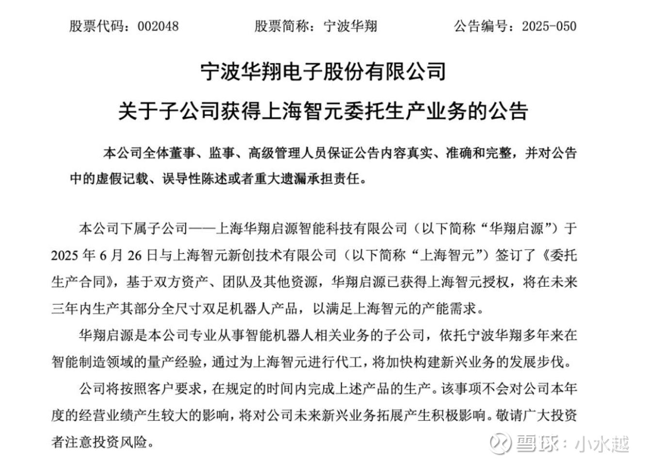 一是智元链的核心标的,华翔启源已获得智元机器人授权,将在未来三年内生产其部分全尺寸双足机器人产品,以满足智元机器人的产能需求。