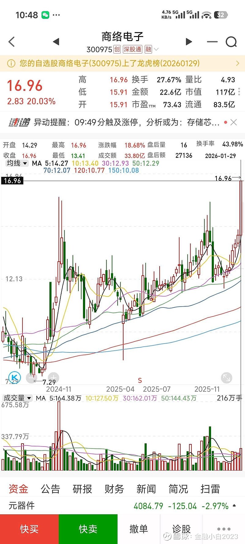 跟了很长一段时间,又找到一位新朋友。$商络电子(SZ300975)$1.个人判断是长达一年的带柄茶杯形态,周线成交量、走势符合形态。2.昨日强势涨停突破。3.昨天涨停、今天大面积绿光的情况下,早晨微跌下午反弹,后续上升有后劲。4.存储芯片和消费电子概念。5.四季度利润增加1.4亿以上,单季利润相当前三个季度利润之和。如果今年一季报再有惊喜,有望能打开后续的星辰大海。仅发表个人看法,盈亏自负。