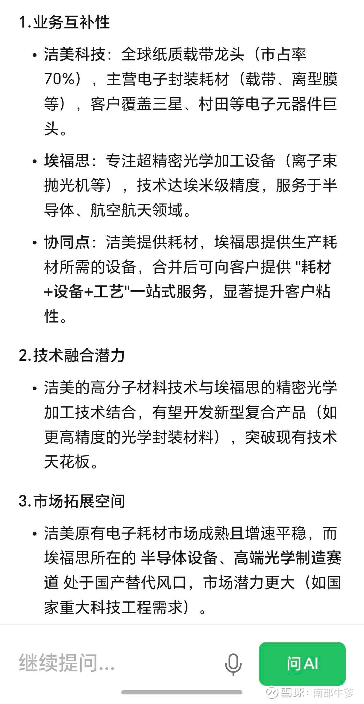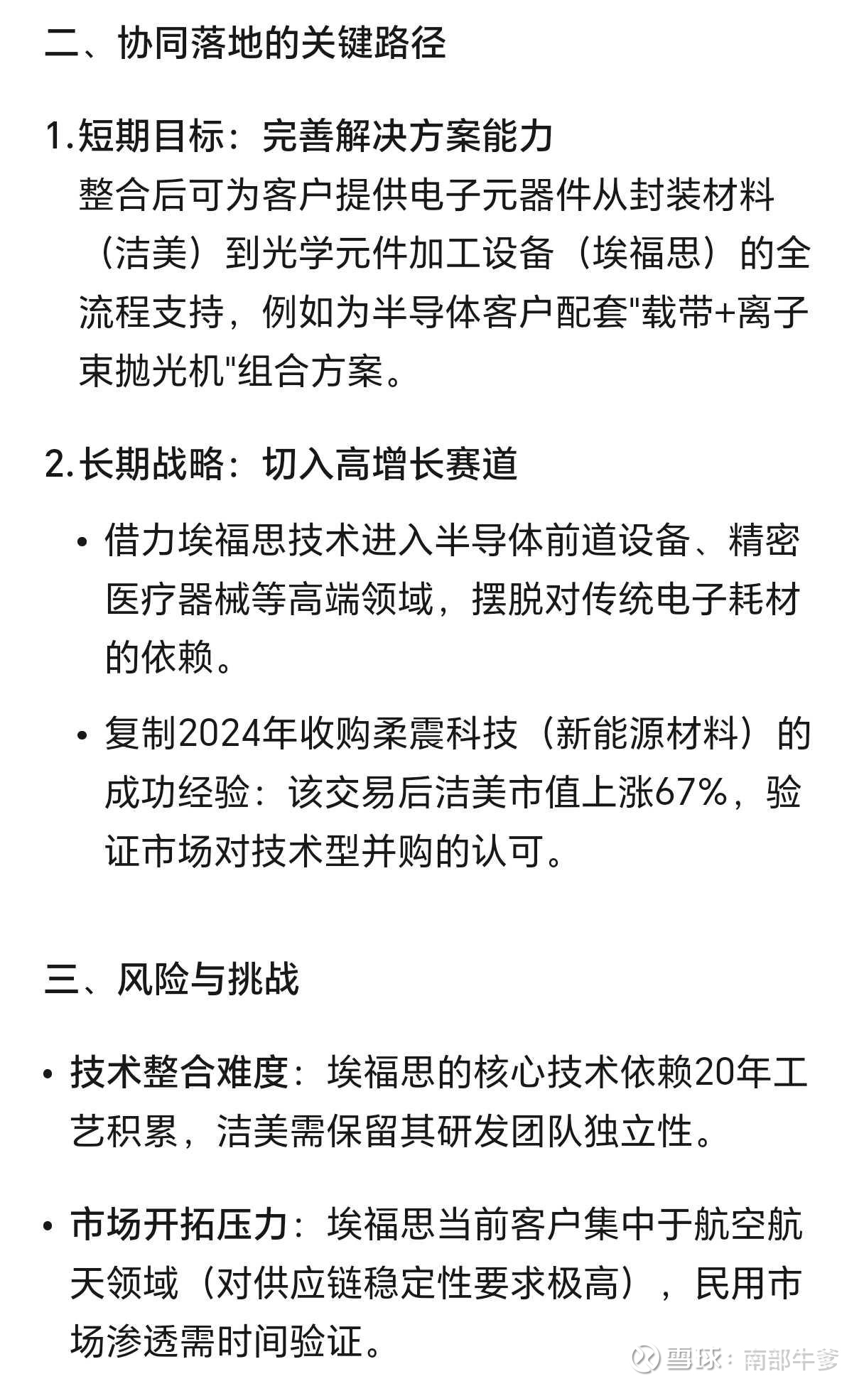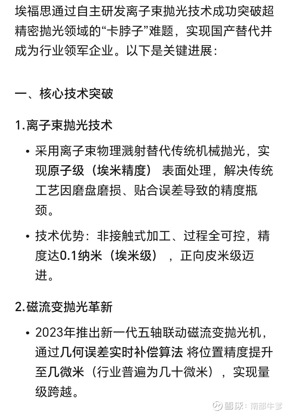 $洁美科技(SZ002859)$ 这里就直接先细说埃福思了,首先技术上突破超精密抛光领域卡脖子技术,再者其所在的 半导体设备、高端光学制造赛道 处于国产替代风口,市场潜力更大(如国家重大科技工程需求)