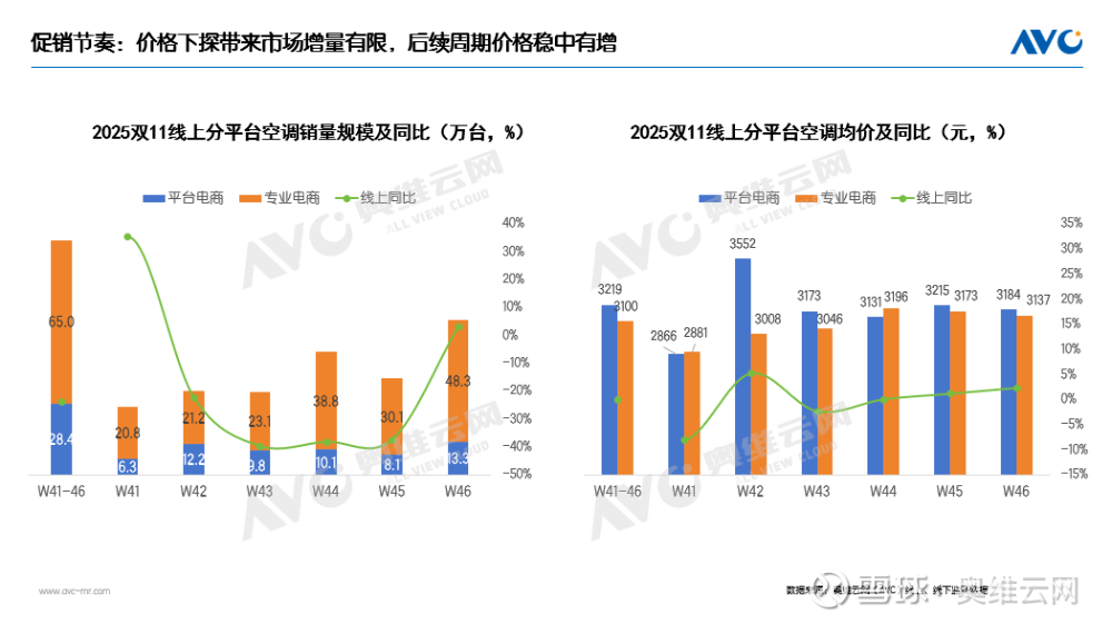 奥维云网(AVC)推总数据显示,2025年双十一促销期(W41-46),空调市场整体呈现大幅回调态势,全渠道零售额线上线下分别降低22.8%和48.0%。依托线上平台超长促销周期影响,整体表现虽优于线下,但同比降幅仍超2成。