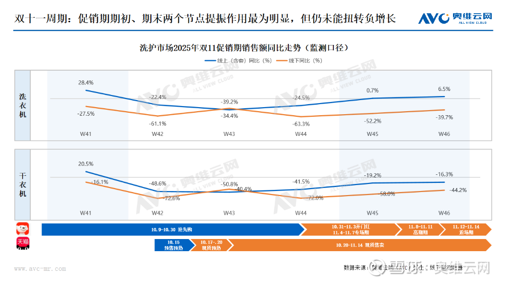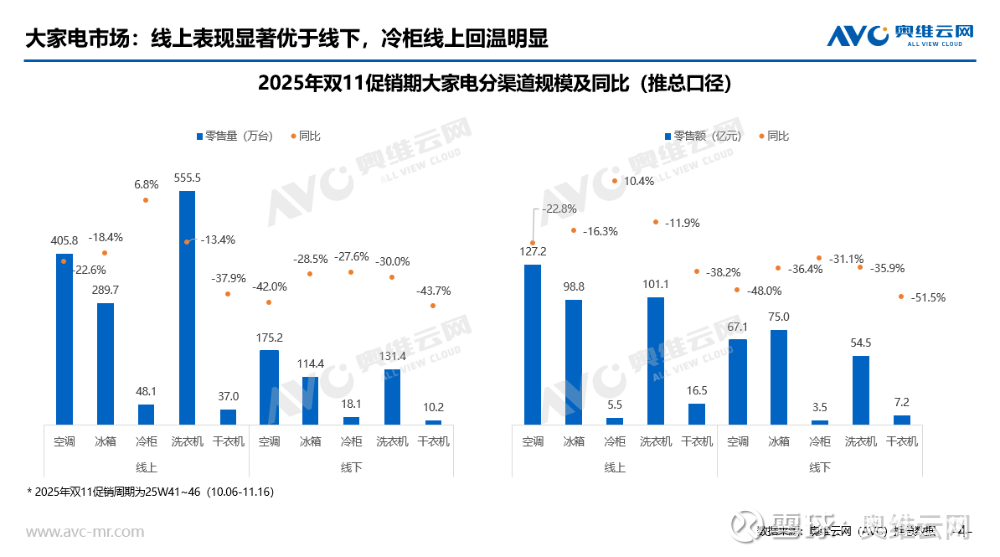 奥维云网(AVC)推总数据显示,2025年双十一促销期(W41-46),大家电市场整体呈现理性回调态势,空调、冰箱、冷柜、洗衣机、干衣机全渠道零售额分别降比33.9%、26.4%、10.4%、22.1%、43.0%。整体来看,除冷柜在线上渠道小幅提升以外,其他品类规模均显著下滑。可见,尽管双十一促销周期延长至6周,但超长促销周期仍难以抵消同期高基数的压力。