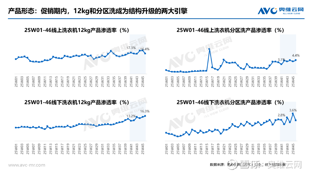双十一促销期间,洗衣机市场的增长动力明确指向产品创新对价格段的结构性拉动。线上数据显示,12kg大容量与分区洗功能渗透率显著提升,其中以统帅、美的、小米为代表的“三区洗”一体化产品竞争尤为激烈。这一趋势在两方面重塑市场格局:一方面,强化了“分区洗”在用户端的心智认知;另一方面,推动竞争维度从单一维度转向价值链管理、产品创新与全域营销的综合较量。这一产品升级路径,直接带动了线上4K–6K中高端价格段的占比提升,体现出价值驱动已成为洗衣机市场结构升级的核心引擎。