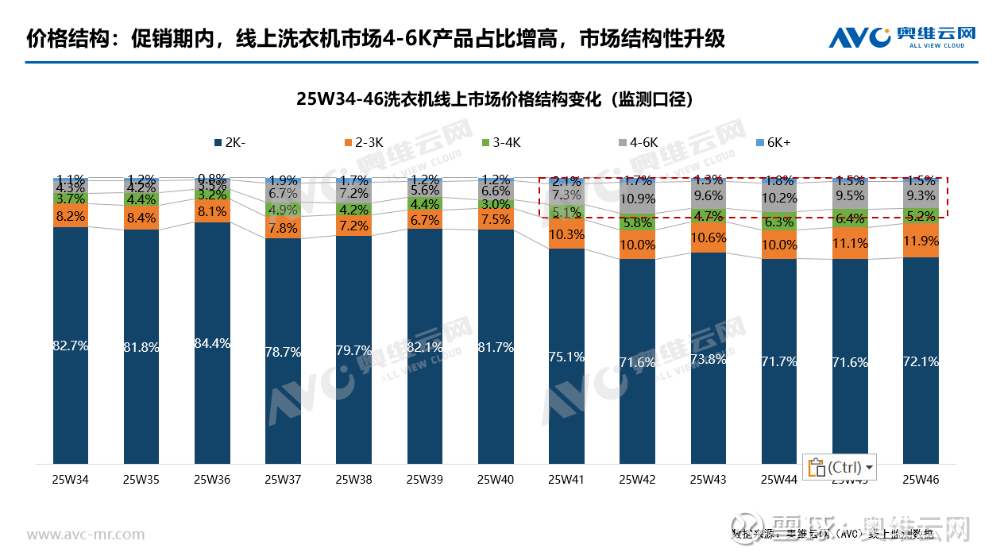 双十一促销期间,首周预热期的降价并未对整体市场起到消费刺激,企业进而选择稳步回升价格,双11(25W41-46)期间,线上价格同比增长0.01%。双十一线上主销价格段从1.5-2.2K回升至2.2-3K价格段,3-4K价格段同比增长4.4%,结构回升明显。