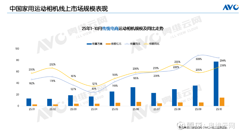 据奥维云网(AVC)线上监测数据显示,2025年1-10月,中国家用运动相机线上市场零售量达286万套,同比增长206%;零售额60亿元,同比增长203%。量额增速均超过200%。运动相机的快速增长并非单一因素驱动,而是技术突破、场景拓展、价格亲民与社交属性共同作用的结果。它从曾经的"极限运动专属装备",演变为如今的"生活记录神器",真正实现了"让每个人都能轻松记录精彩瞬间"的愿景。