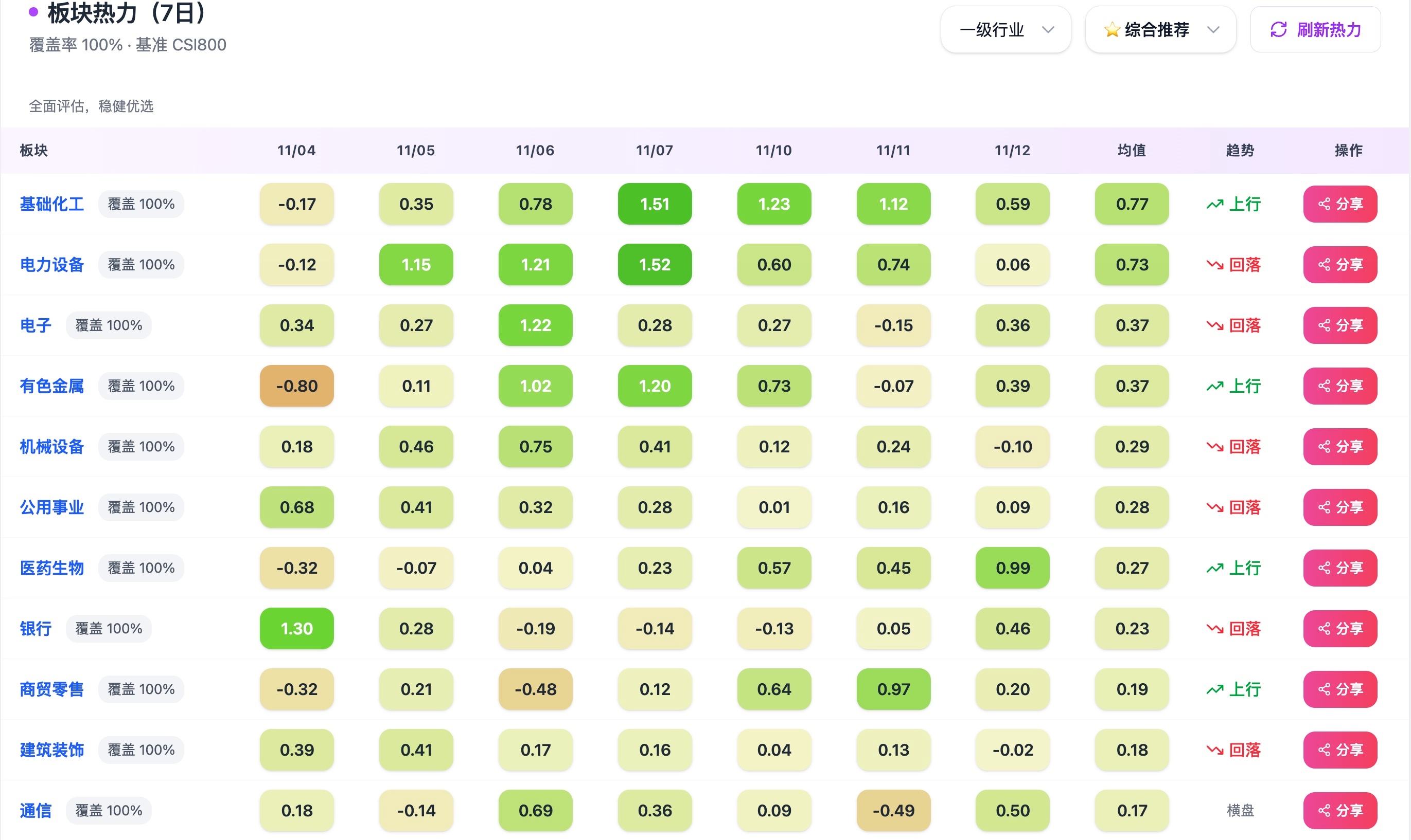 基础化工:均值 0.77 → 🔼上行,成为近两日主线之一;