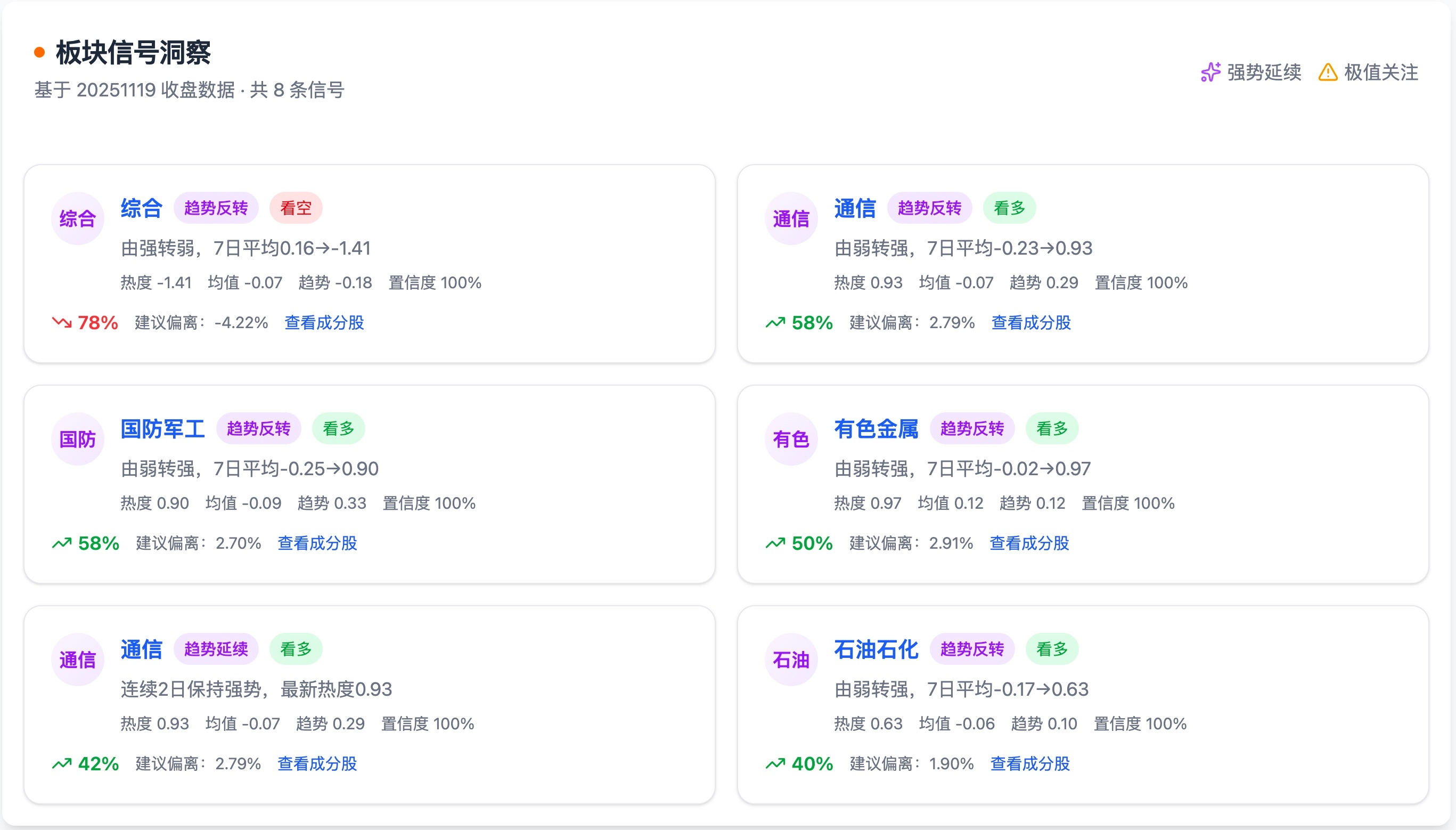 趋势延续:通信(同时出现反转与延续的组合信号,强度较高)。