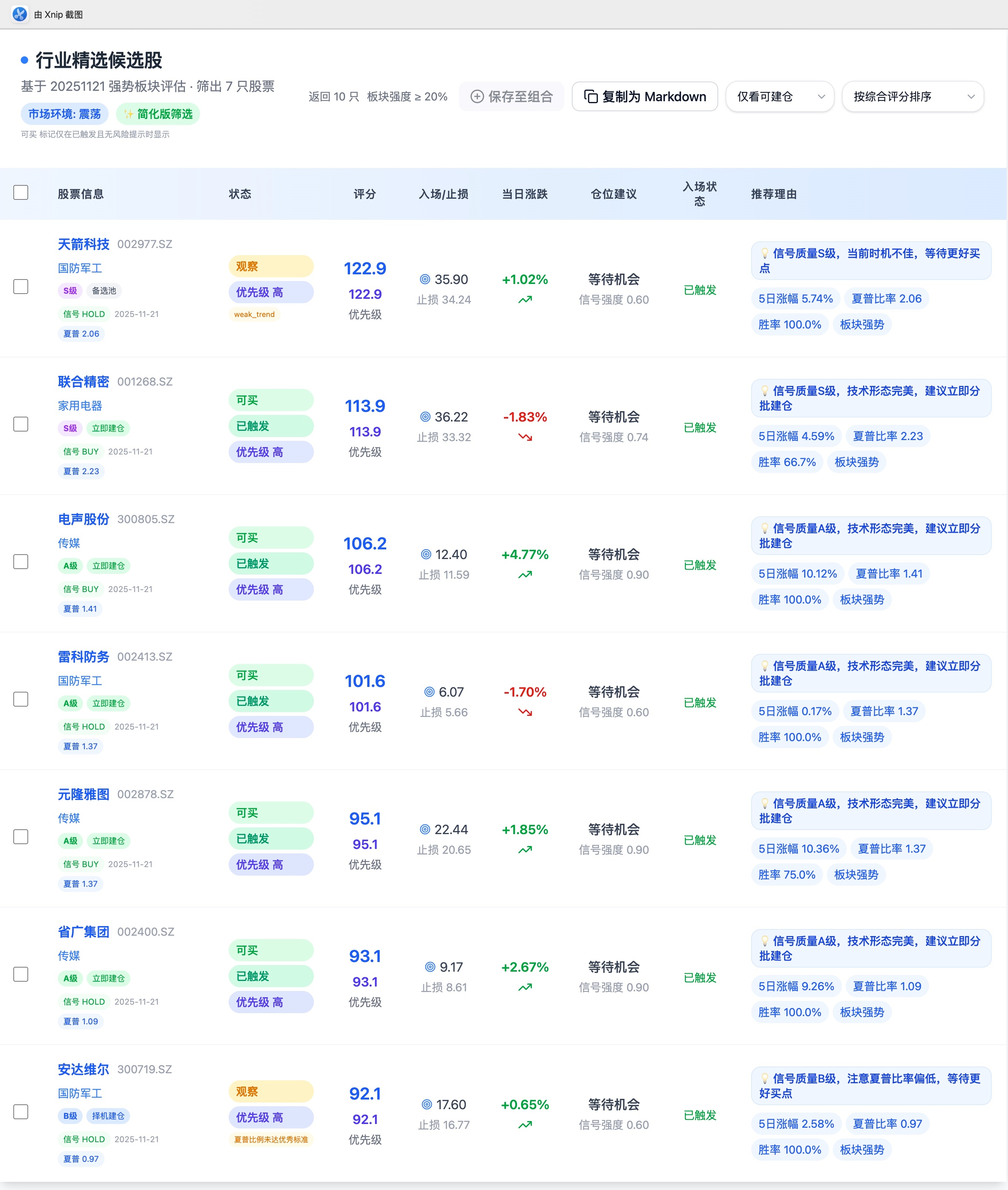 强势区(评分≥70):雷科防务、联合精密、(传媒)电声股份/元隆雅图/省广集团 —— 右侧分批,量价共振优先。