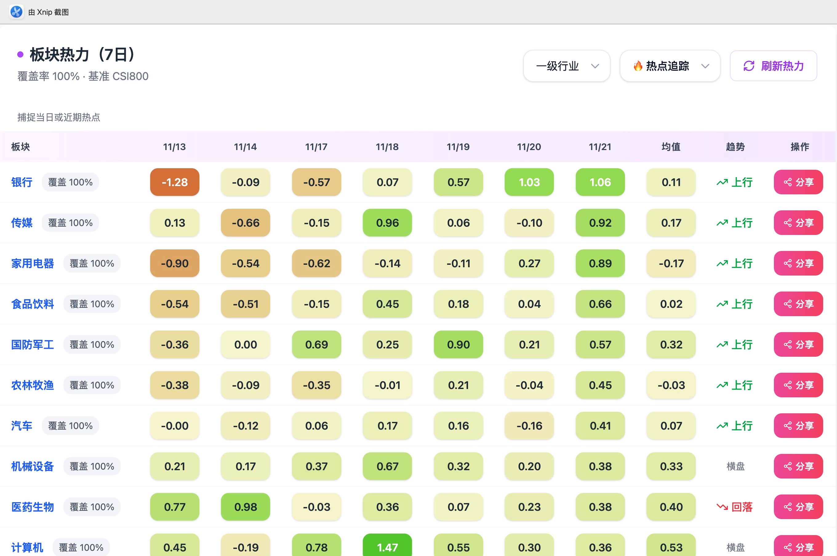 7日板块热力:通信、银行连续走强;电子与计算机边际修复;有色金属与医药生物高位回落;建筑材料低位修复,家电冲高回落。