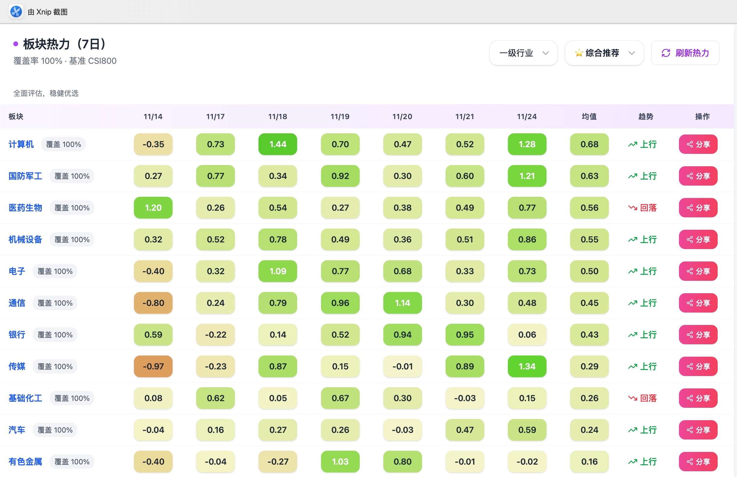 国防军工:热度 1.21,延续强势,适合“小步快跑”。