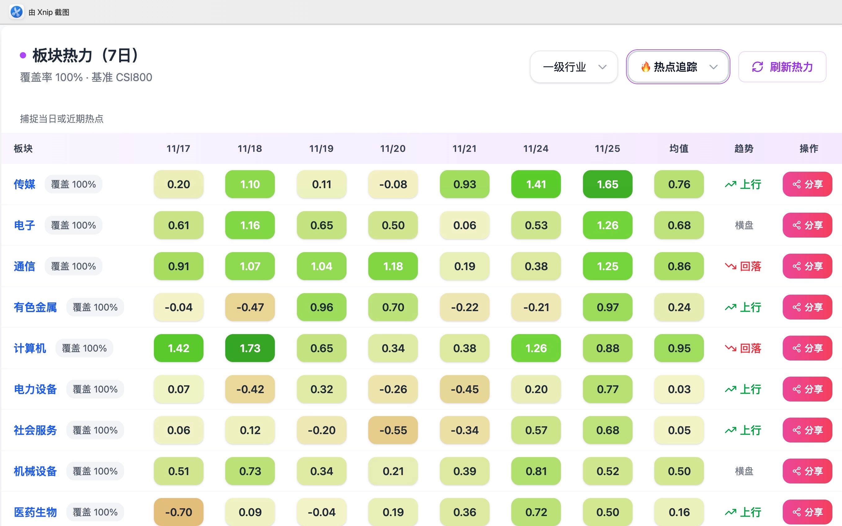 7日热力:传媒、电子、计算机三线整体维持高位;有色与计算机在高位出现震荡/分化,通信冲高后回落。