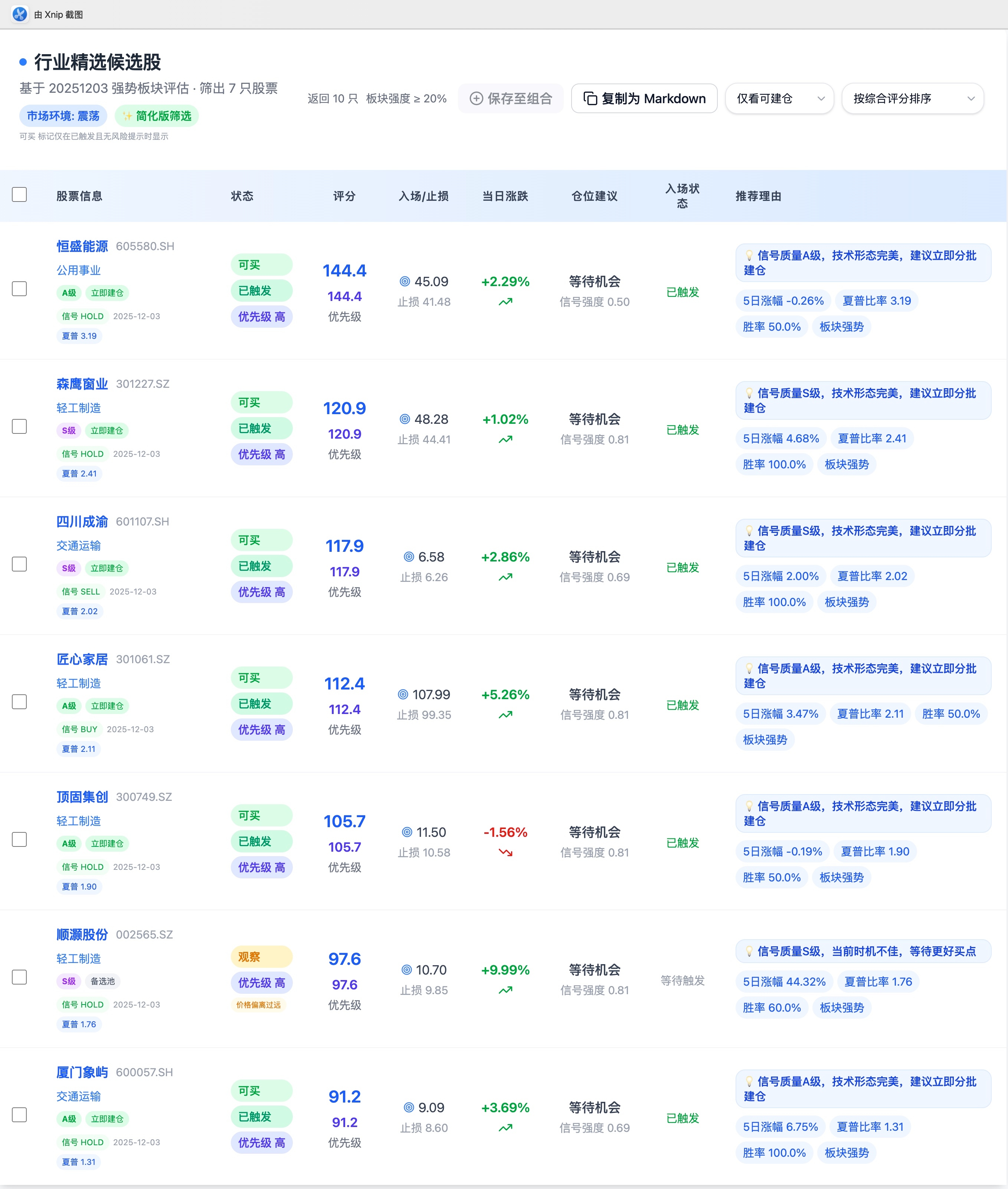 强势区(评分≥70):森鹰窗业、四川成渝、恒盛能源 —— 右侧分批,量价共振优先。