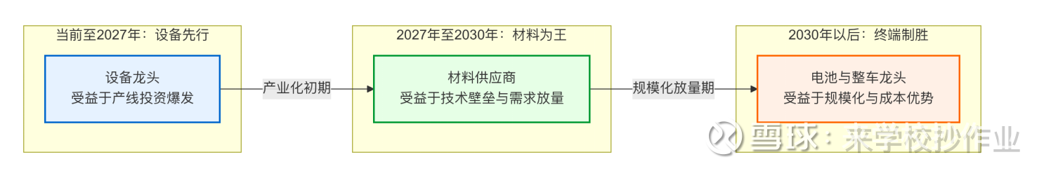 产业链价值重构:固态电池的产业化将深刻重构现有锂电池产业链的价值分布,核心变化体现在设备环节短期率先受益,材料环节占据中期核心壁垒。
