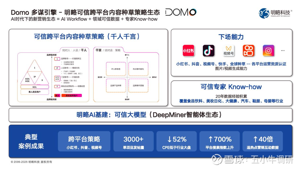 底层资源层则由明略科技旗下可信跨平台内容种草生态DOMO进一步夯实,基于全网数据洞察与AIGC能力,为品牌提供从内容洞察、创意生成到效果衡量的全链路支持。