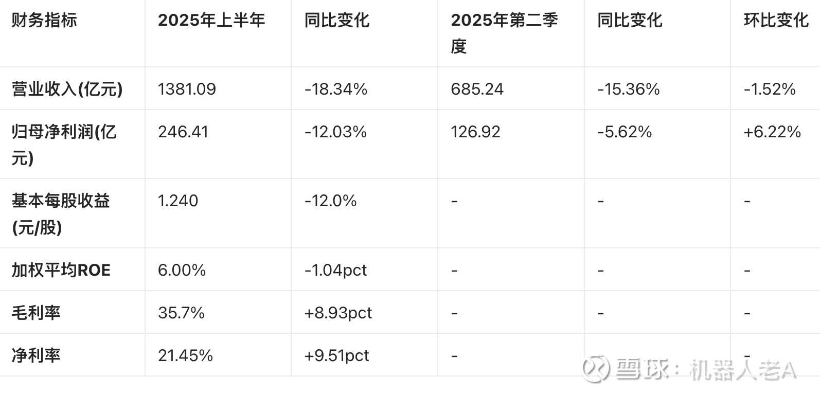 从ROE(净资产收益率)来看,2025年上半年公司加权平均ROE为6.00%,同比下降1.04个百分点。ROE下降主要是因为净利润规模收缩,但考虑到公司净资产基数较大,6%的ROE水平在行业内仍属稳健。