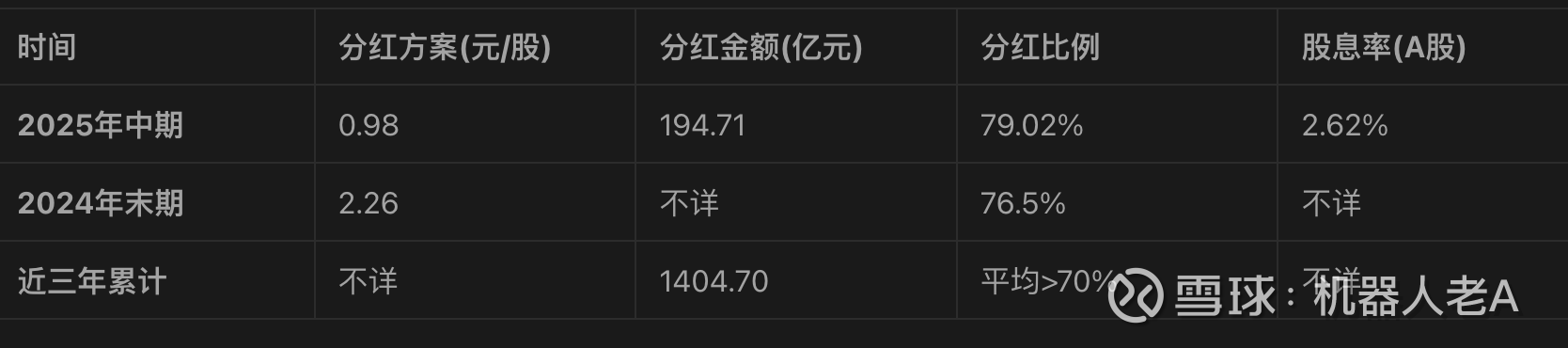从股息率角度看,按2025年中期分红0.98元/股计算,A股股息率为2.62%。如果下半年维持相似分红比例,全年股息率有望超过5%,在当前市场环境下具有显著吸引力。