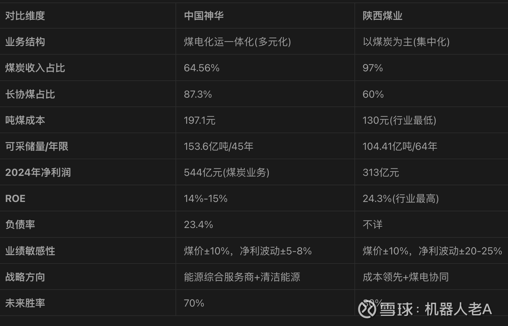 从未来发展趋势看,中国神华因政策契合度高(国家能源保供主力)、现金流支撑转型投入、国际化项目规避地缘风险,被给予70%胜率;陕西煤业需实现"成本优势+煤电协同+氢能突破"三重跃迁,否则难逃周期束缚,胜率仅30%。