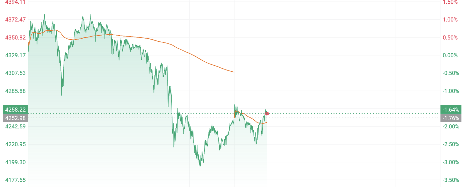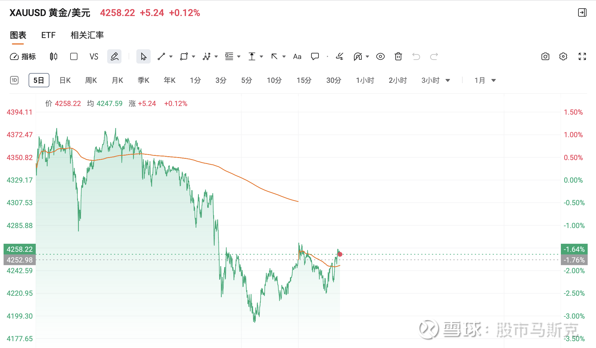 黄金现货价格跌幅明显,周五跌破4300美金,周度涨6%,目前报4260美元附近