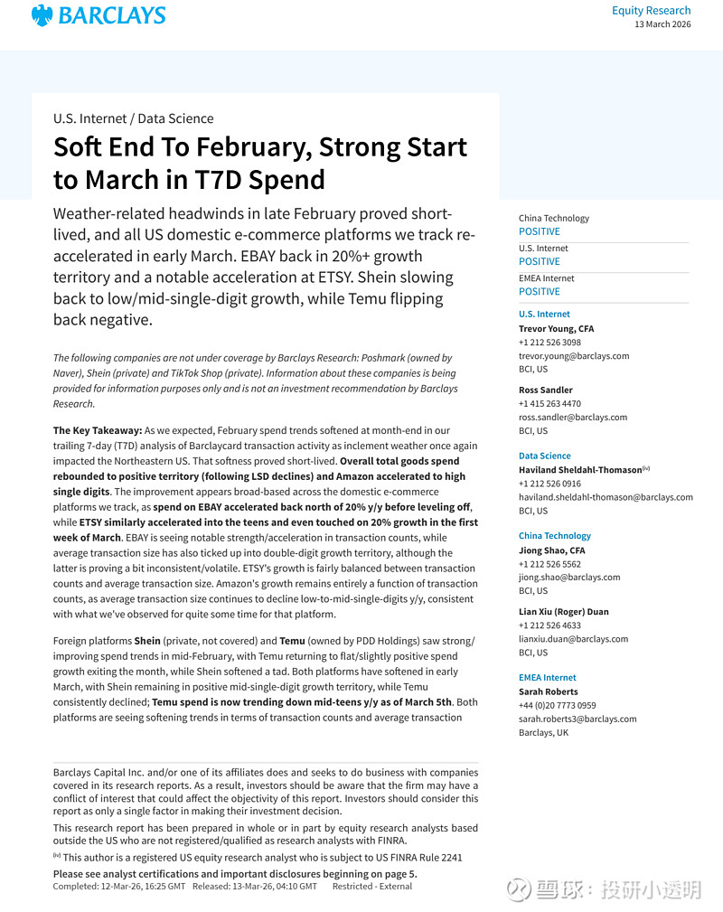 核心观点:2026年2月下旬受恶劣天气影响的美国电商支出在3月初迅速反弹。国内平台(Amazon、eBay、Etsy)增速显著回升,而海外竞争对手(Temu、Shein)增长放缓甚至转负。巴克莱维持对美国电商行业的正面展望,认为国内平台在竞争格局中表现出更强的韧性,且退税因素持续支撑消费。
