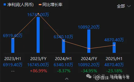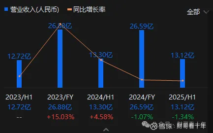 2022-2024年,公司收入分别为23.36亿元、26.88亿元和26.59亿元,三年收入复合增速较低,且2024年出现同比微降1.1%。2025年上半年收入13.12亿元,同比继续下滑1.34%。