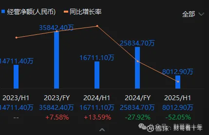 2025年上半年经营现金流同比腰斩52%,仅剩0.80亿元。结合2024年净利润1.09亿元计算,经营现金流与净利润的比率远低于健康水平,反映公司盈利质量下降和营运资金管理压力增大
