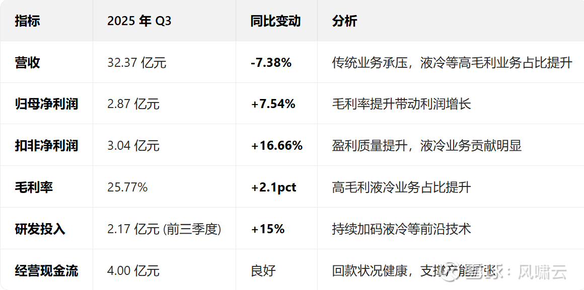 业绩拐点明确:2025 年 Q3 扣非净利润同比增长 16.66%,液冷订单加速落地