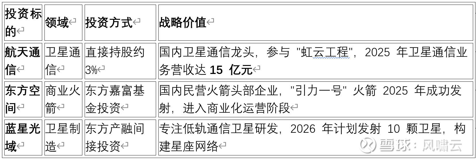 浙江东方通过旗下东方嘉富、东方产融及航天通信(直接持股) 等方式,布局商业航天产业链关键环节:
