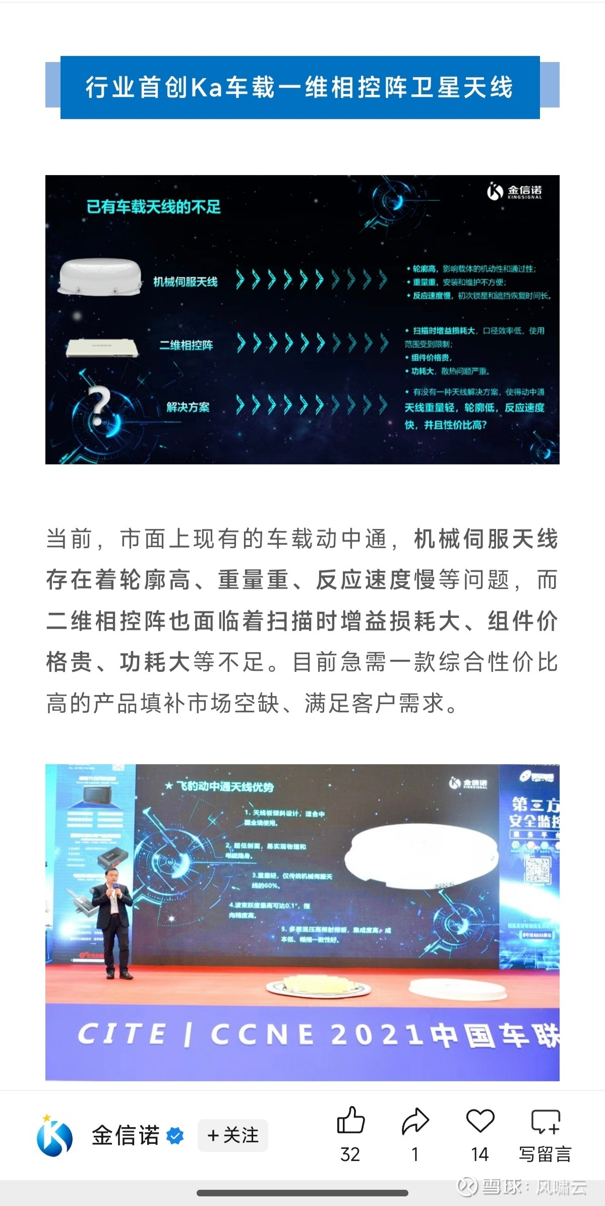 地面与终端产品: Ka 车载一维相控阵天线:行业首创,解决传统机械伺服天线 “轮廓高、重量重、反应慢” 与二维相控阵 “增益损耗大、成本高、功耗高” 的痛点,具备重量轻、轮廓低、反应速度快、性价比高的优势,适配车载动中通场景。 Ku 频段便携终端:针对国内首颗高通量卫星亚太 6D 定制开发,为非固定式卫星通信场景提供支撑,已应用于应急通信、野外作业等场景。