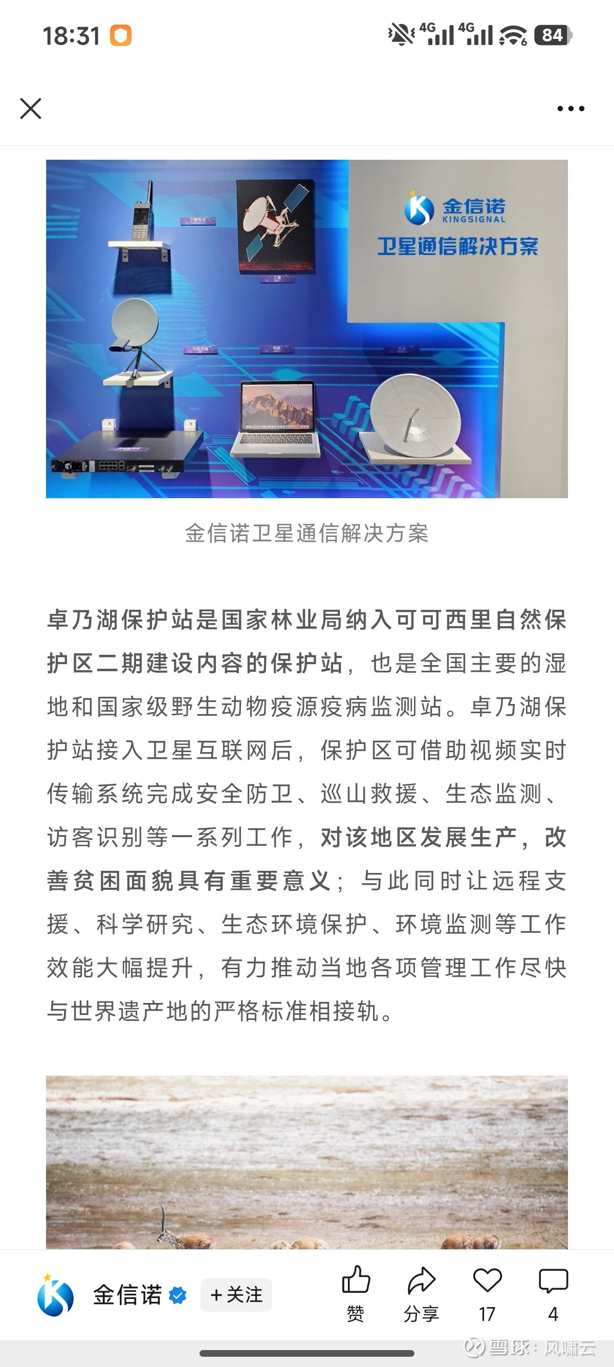 解决方案落地:为可可西里卓乃湖保护站提供卫星互联网接入方案,实现视频实时传输、生态监测、巡山救援等功能,提升保护区管理效能,验证了公司卫星通信解决方案的实战价值。