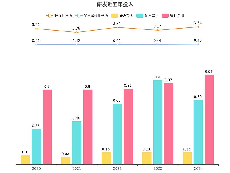 近五年,启迪药业研发投入不及销售和管理费用,近五年研发投入为5697.29万,研发占营业收入比率从2020年的3.49%提升到2024年3.84%