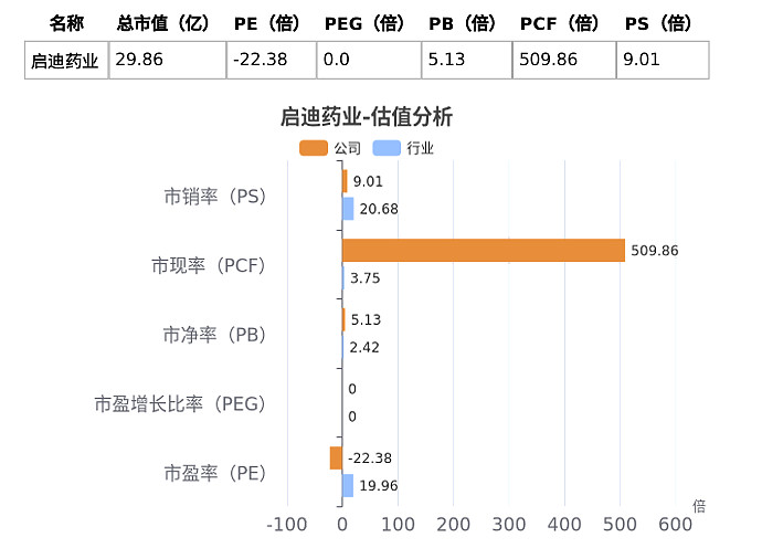 从行业估值来看,启迪药业当前动态估值指标中,PEG、PB、PCF高于行业均值,股价有一定的概率被相对高估,同时PE<0,PEG>0,表明税后利润和净利润增长率均为负,保持谨慎。