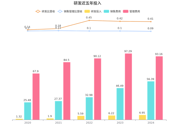 近五年,贵州茅台研发投入不及销售和管理费用,近五年研发投入为21.97亿,研发占营业收入比率从2020年的0.14%提升到2024年0.41%