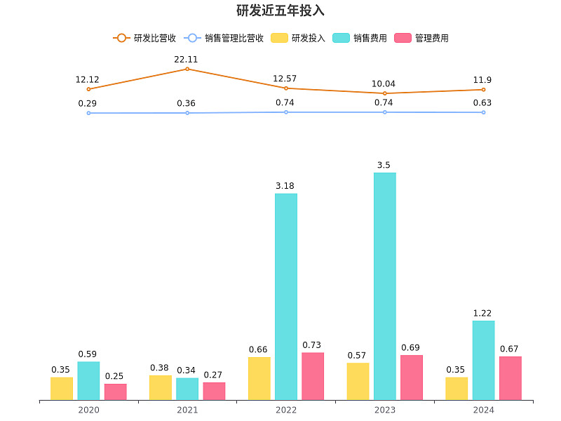 近五年,古鳌科技研发投入不及销售和管理费用,近五年研发投入为2.32亿,研发占营业收入比率从2020年的12.12%降低到2024年11.90%。