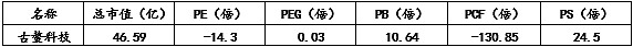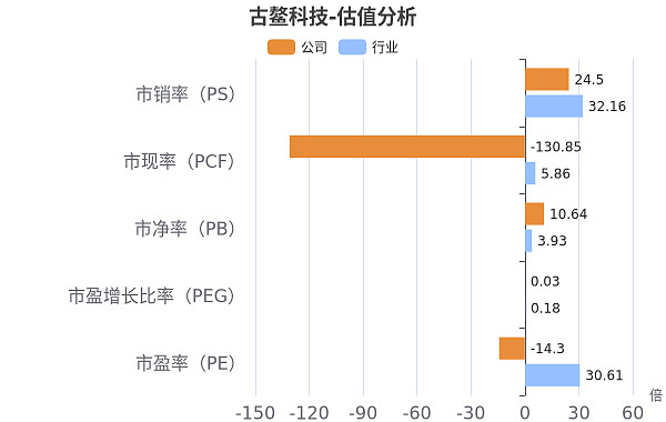 从行业估值来看,古鳌科技当前动态估值指标中,PB高于行业均值,且PE<0,PEG>0,表明税后利润和净利润增长率均为负,PCF<0,表明现金流为负,资金回笼效率较低,保持谨慎。