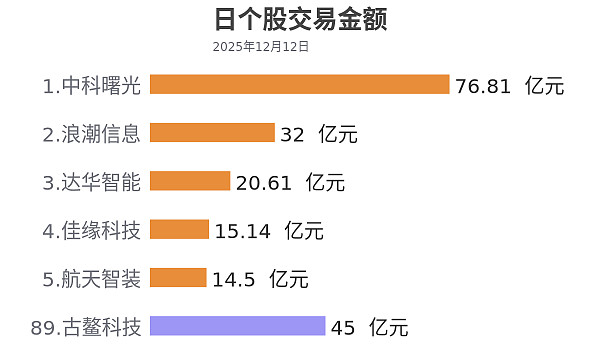 根据日个股交易金额排序,古鳌科技的日个股交易金额为0.0元,在计算机设备行业中,排名第89,排名前三位的分别是:中科曙光,浪潮信息,达华智能。