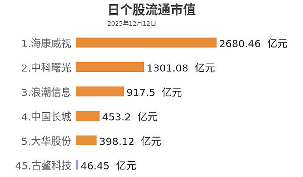 根据日个股流通市值排序,古鳌科技的日个股流通市值为46.45亿元,在计算机设备行业中,排名第45,排名前三位的分别是:海康威视,中科曙光,浪潮信息。