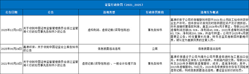 因涉嫌信息披露违法违规被立案已是公司近五年来第二次。此前,因对2019年报、2020年一季报、2020年半年报以及2020年三季报的营收、净利润进行虚假记载。2020年12月,嘉澳环保公告称被证监会立案调查。2021年5月,浙江证监局对嘉澳环保罚款100万元,并对董事长沈健、财务总监查正蓉等高管处以警告及罚款。